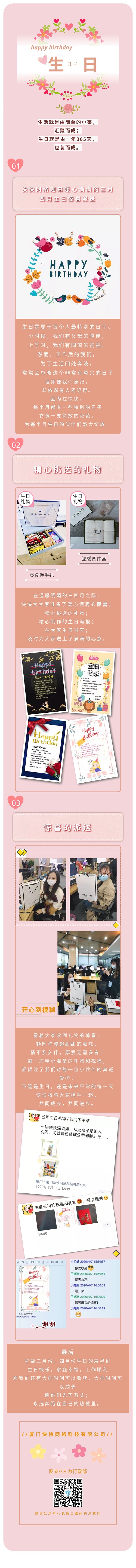 攜一縷初夏的芬芳 鳴一曲溫馨婉轉(zhuǎn)的賀歌 5月11日,快快網(wǎng)絡(luò)為5月份生日的員工 舉辦了一場溫馨的生日party 一年中,最期待的時(shí)刻莫過這一天 歡笑、嬉笑、感動(dòng)、感恩...... 我們何其幸運(yùn),一定是特別的緣分 才讓我們一路走到快快變成一家人 今天,為了感謝小伙伴們的付出與堅(jiān)持 快快網(wǎng)絡(luò)為5月份生日的員工準(zhǔn)備了生日慶祝會(huì)! 做有態(tài)度的IDC商 是快快網(wǎng)絡(luò)的服務(wù)宗旨 務(wù)實(shí)創(chuàng)新,共同創(chuàng)造無限的幸福生活和美好體驗(yàn) 于快快而言 不僅僅是對客戶、對社會(huì)的莊嚴(yán)承諾 也是一種對員工的關(guān)愛和責(zé)任 今天是溫馨的一天 精心布置的生日會(huì)、精美的生日蛋糕 是快快網(wǎng)絡(luò)為每一位壽星準(zhǔn)備的驚喜! 精心準(zhǔn)備的生日蛋糕及精美的生日禮物 是快快網(wǎng)絡(luò)對壽星們的祝福與關(guān)愛! “祝你生日快樂,祝你生日快樂.....” 全場一同唱起了生日快樂歌 壽星們一起許心愿、吹蠟燭、切蛋糕 將生日會(huì)的氣氛推向了高潮 公司還為壽星”們準(zhǔn)備了的一場神秘生日禮物。 在歡聲笑語中,員工們一起度過了一個(gè)不一樣的生日 感受到了團(tuán)隊(duì)中家一般的溫暖。 為員工過生日 這只是一個(gè)小小的舉動(dòng) 但卻傾注了快快網(wǎng)絡(luò)對每一位員工的關(guān)愛! “員工生日會(huì)”是快快網(wǎng)絡(luò)一直以來堅(jiān)持的傳統(tǒng) 公司認(rèn)為,員工是企業(yè)的生產(chǎn)力 人才是企業(yè)最寶貴的財(cái)富 通過這樣的活動(dòng)以放松員工心情、減緩壓力 增進(jìn)公司與員工,員工與員工之間的感情 這也是提倡公司文化、實(shí)施人性化管理的一個(gè)舉措。