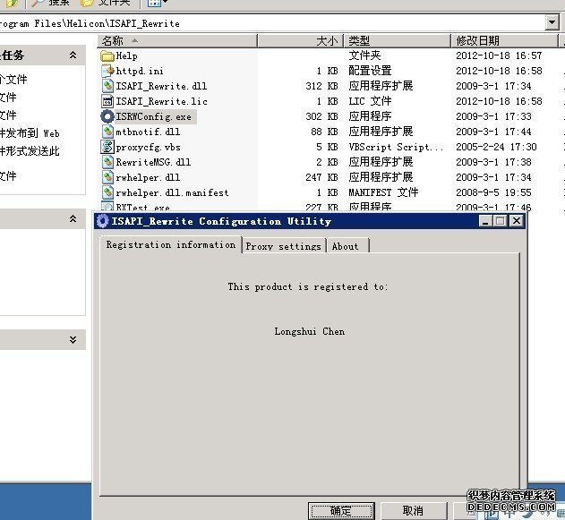 ISAPI_Rewrite Full for Windows NT4/2000/XP/2003 http://www.isapirewrite.com/download/isapi_rwf_x86_0073.msi ISAPI_Rewrite Full for Windows Vista & Windows Server 2008 http://www.isapirewrite.com/download/isapi_rwf_x86_vista_0073.msi 可用注冊碼: user: Longshui Chen sn: 7Z3NU-7MAP5-JZDPH-PR9GK 注冊方法: 到ISAPI_Rewrite安裝目錄,找到"ISAPI_Rewrite Configuration Utility"程序,打開后輸入注冊碼即可注冊成功。 安裝: ISAPI Rewrite在安裝上相當(dāng)方便,如果你下載的是安裝包,只需要按照提示進(jìn)行安裝即可。而如果你下載的是壓縮包,那么只要將文件夾解壓縮的任意目錄,然后在IIS站點(diǎn)的ISAPI篩選器中添加ISAPI Rewrite的dll即可。 在站點(diǎn)屬性中,選擇ISAPI篩選器,然后添加ISAPI Rewrite組建即可。 如果使用MSI安裝包的話就不需要此步驟,因為安裝包會自動添加ISAPI Rewrite組建。 需要注意的問題: 1.必須給予ISAPI Rewrite所在目錄IIS_WGP組的讀寫權(quán)限,否則你的網(wǎng)站就會直接Service Unavailable,應(yīng)用程序池遇到錯誤而停止。在事件查看器中可以找到相應(yīng)的錯誤。 2.默認(rèn)是裝在C:\Program Files\Helicon下,要注意的是這個目錄everyone要有讀取權(quán)限。沒有的話需要自己手動添加. ISAPI Rewrite無效或ISAPI Rewriterule無效的幾個可能原因: 1、最可能的原因:C:\Program Files\Helicon沒有開放everyone組的讀取權(quán)限。 2、其次可能原因:C:\Program Files\Helicon已經(jīng)開放everyone組的讀取權(quán)限,但沒有重啟IIS。 3、不可能的原因1:雖然URL Rewrite功能看起來像是新建了目錄,但實(shí)際上網(wǎng)站程序所在目錄對于everyone組只要有普通的讀取權(quán)限,并不需要有寫權(quán)限。只要網(wǎng)站能被訪問就不是這個網(wǎng)站權(quán)限設(shè)置的問題。 4、不可能的原因2:不需要像網(wǎng)上那么多的教程那樣在IIS中做其他設(shè)置(在每個站點(diǎn)都添加了ISAPI Rewrite的ISAPI篩選器,對于這個免費(fèi)版,安裝完即可在也只能在全局范圍內(nèi)生效。所以不需要對每個站點(diǎn)進(jìn)行設(shè)置。 5、改了權(quán)限后,必須在服務(wù)里重啟一下IIS服務(wù)。安裝完后應(yīng)該有一次自動的重啟。