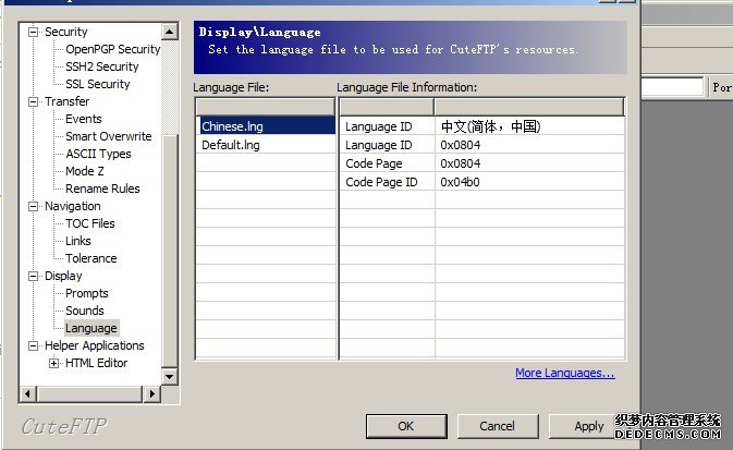 CuteFTP是最好的FTP客戶程序之一,如果你是CuteFTP 老版本的用戶,你會發(fā)現(xiàn)很多有用的新特色。目錄比較,宏,目錄上 載和下載,遠程文件編輯,以及IE風格的工具條等等,定會令你愛不 釋手。 3.1版主要特色包括:上載下載隊列,上載斷點續(xù)傳,整個目錄 覆蓋和刪除,等等。建議將測試版安裝到不同的目錄,或者備份原來 安裝的目錄。2.6版包含URL解析和剪貼板監(jiān)視 有圖有真相 解壓軟件后就可以直接用,但還要破解和漢化的話需要打開patch.exe和font-fix.exe這2個程序,沒有毒放心用就是了,我用了幾年了,一直在用。 打開patch.exe點綠色的框框,然后點紅色框框退出就破解了。 打開font-fix.exe點修正字體就可以了 這樣就破解和漢化了,但是現(xiàn)在軟件打開還是英文版的,所以需要進軟件選擇語言為中文版,可以按快捷鍵alt+F4就可以進入軟件設置選項如下圖 選擇中文為默認的顯示語言就可以點OK了,然后關閉軟件再打開你就會發(fā)現(xiàn)是中文的了。好軟件大家起分享,希望對大家有用。
