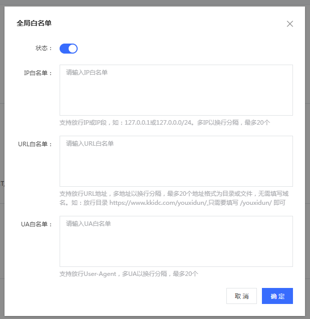 白名單中的 IP/URL/UA,其訪問請(qǐng)求將無需執(zhí)行 CC 攻擊檢測,直接被放行。