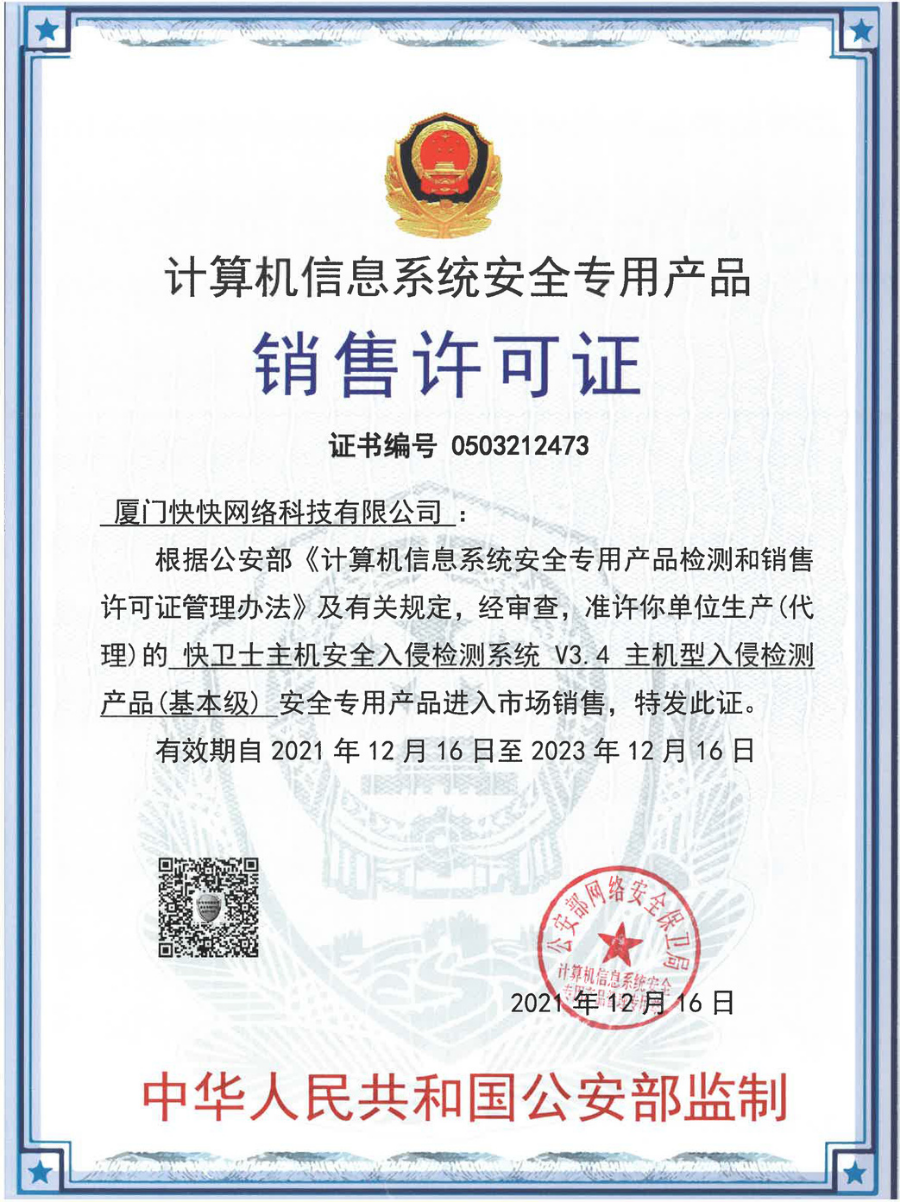 2021年12月16日,快衛(wèi)士獲得公安部銷(xiāo)售許可證,這意味著快衛(wèi)士通過(guò)嚴(yán)密安全功能測(cè)試及高標(biāo)準(zhǔn)級(jí)別的驗(yàn)證,可為更多領(lǐng)域客戶提供網(wǎng)絡(luò)安全服務(wù),標(biāo)志著快快網(wǎng)絡(luò)在網(wǎng)絡(luò)安全領(lǐng)域的產(chǎn)品研發(fā)和技術(shù)服務(wù)水平具有更加強(qiáng)大的競(jìng)爭(zhēng)力。